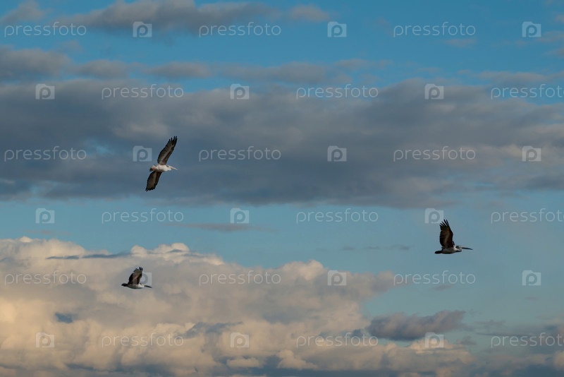 Западная Африка. Сенегал. Небольшая стая пеликанов дружно летят на фоне облаков и синего неба