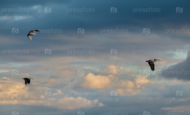 Западная Африка. Сенегал. Небольшая стая пеликанов дружно летят на фоне облаков и синего неба