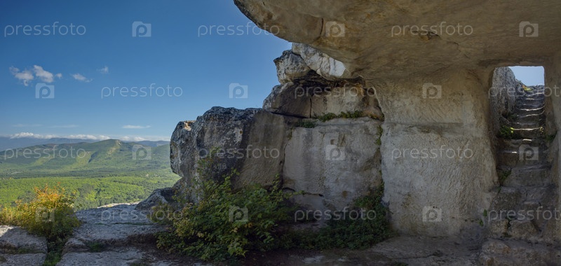 Вид на полуразрушенные горы с вершины полуразрушенной каменной крепости знаменитого города Мангуп-Кале V века в Бахчисарайском районе