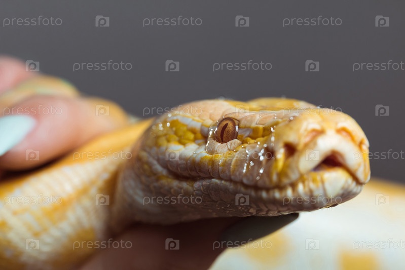 Желтый пятнистый питон в женских руках крупным планом