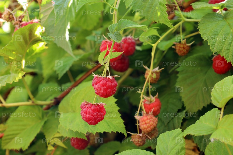 Ярко-красная малина созревает в саду жарким солнечным летним днем