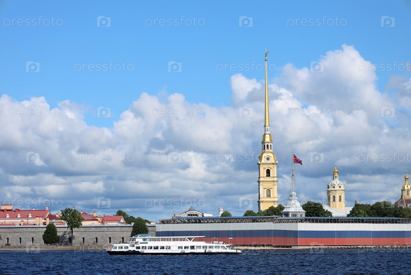 Прогулочный катер на Неве на фоне Петропавловской крепости (Санкт-Петербург, Россия)