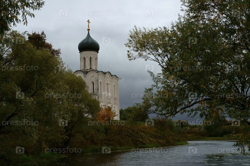 Часть церкви Покрова на Нерли видна в глубине деревьев, на переднем плане река Нерль, город Владимир, Россия