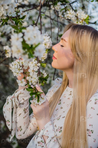 Красивая светловолосая женщина с закрытыми глазами в цветущем вишневом саду в солнечный весенний день