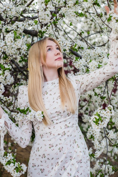 Красивая блондинка в весеннем саду с цветущей вишней. Фото на обложке