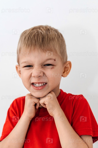 Вертикальное фото мальчика, который злится. У него царапина на лице и стиснутые зубы. Белый фон