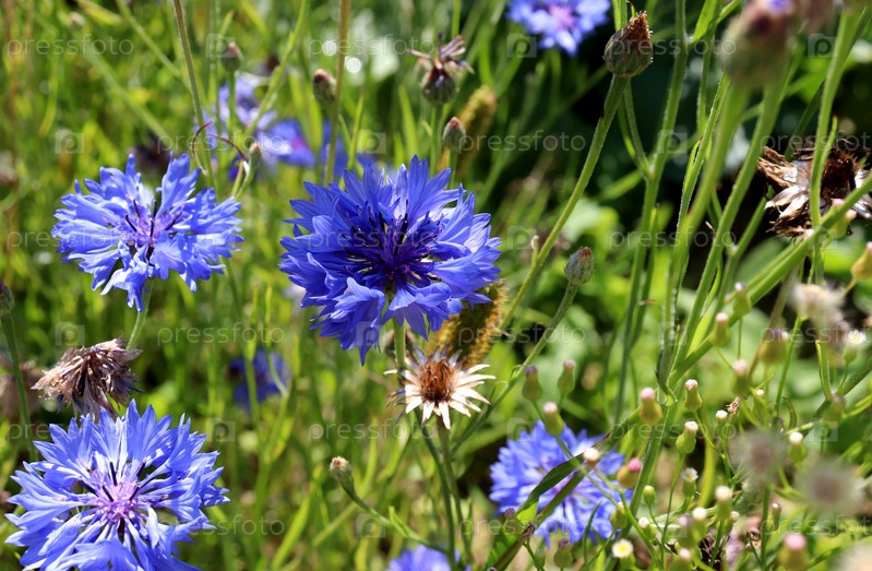 Синие васильки с бутонами и сухими цветами на лугу в солнечный день среди стеблей и травы