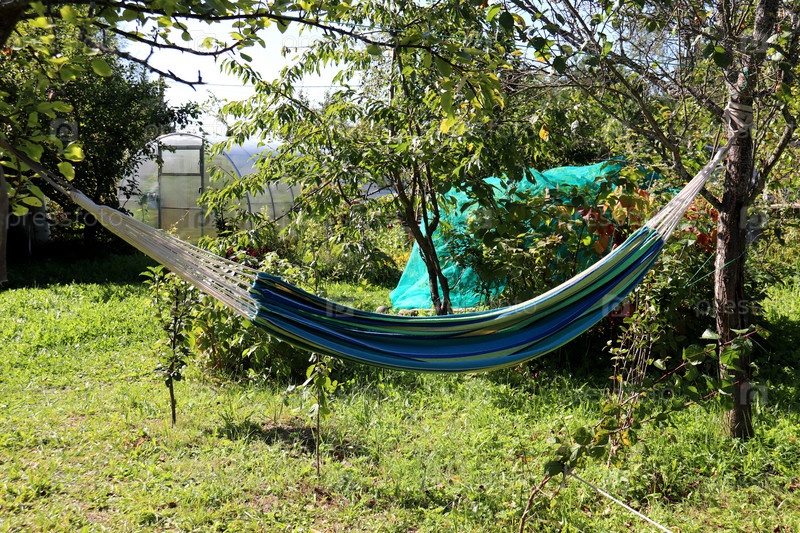 Полосатый гамак висит между яблонями в саду напротив теплицы