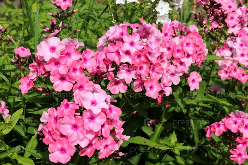 Куст розовых флоксов на клумбе в саду в солнечный день