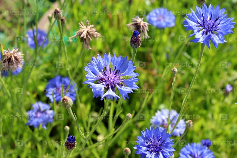 Синие васильки с бутонами и сухими цветами на лугу в солнечный день