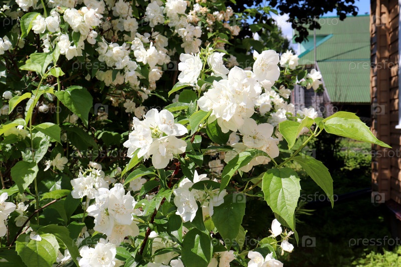 Цветущий куст чубушника на фоне угла одного сельского дома и крыши другого дома