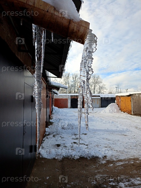 Сосульки свисают с водосточной трубы на крыше на фоне гаражей в тени