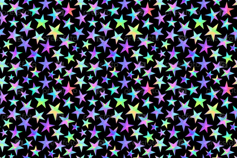 Радужные голографические звезды на черном фоне. Бесшовный растровый узор