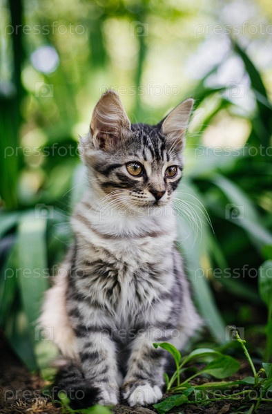 Милый, серый полосатый котенок сидит на пятачке сочной зеленой листвы. Котенок смотрит в сторону, его хвост заправлен под тело