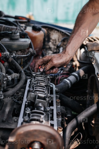 Рабочий ремонтирует головку блока цилиндров автомобильного двигателя. Клапан удаления масла. Ремонт автомобилей. Автосервис