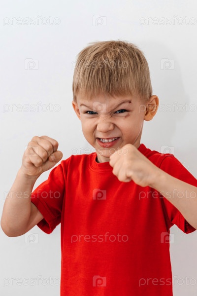 Мальчик сердится, сжимает зубы, держит кулаки перед собой. У него царапина на лице и уверенный взгляд. Концепция защиты и самообороны