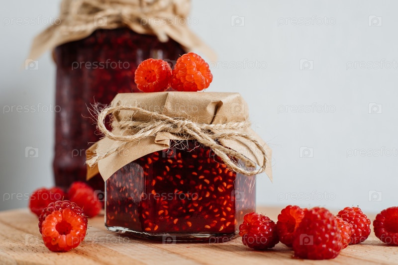 Вкусное домашнее малиновое варенье в очаровательной банке на деревенской деревянной доске, украшенной бумагой и шпагатом. Свежая малина добавляет яркий цвет