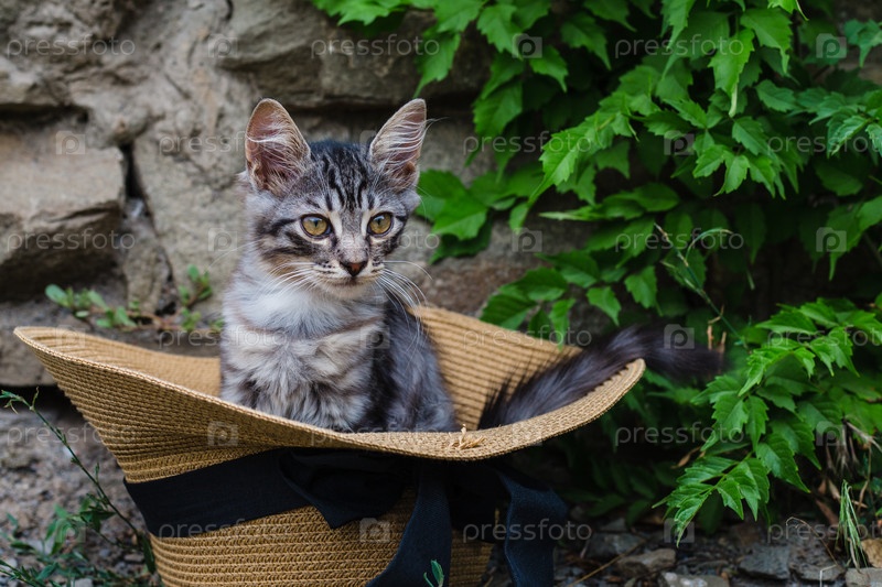 Милый котенок сидит в соломенной шляпе на открытом воздухе с каменной стеной и зелеными растениями