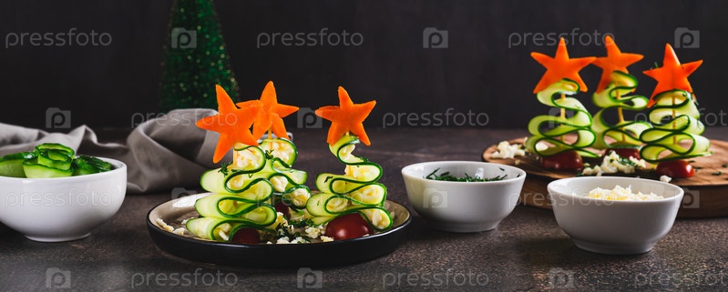 Закусочные деревья из огурцов, помидоров и сыра на тарелке на столе веб-баннер