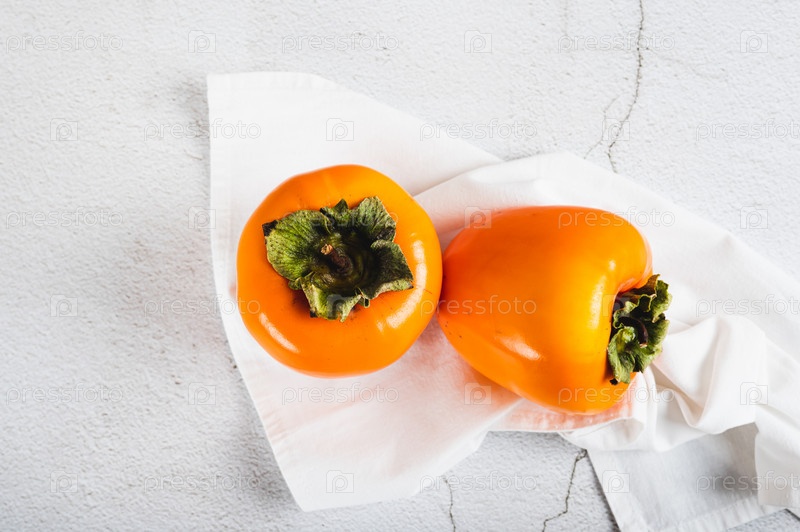Две целых спелых свежих хурмы на белой салфетке на столешнице