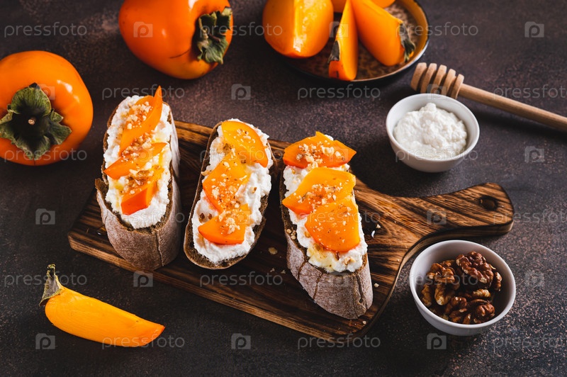Сладкая брускетта с хурмой и рикоттой на доске на столе