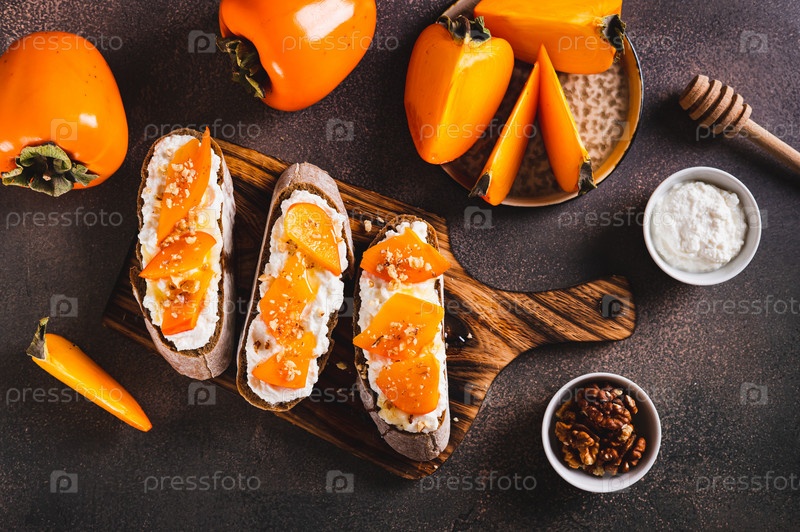 Сэндвичи на ржаной чиабатте с рикоттой, хурмой, медом и орехами на доске вид сверху
