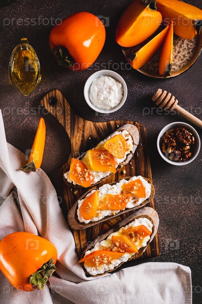 Сладкая брускетта с хурмой и рикоттой на доске на столешнице и вертикальный вид