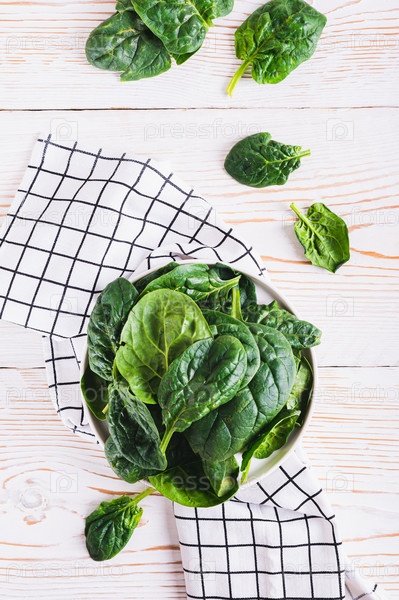 Свежие зеленые листья шпината на белой тарелке на деревянной столешнице и вертикальный вид
