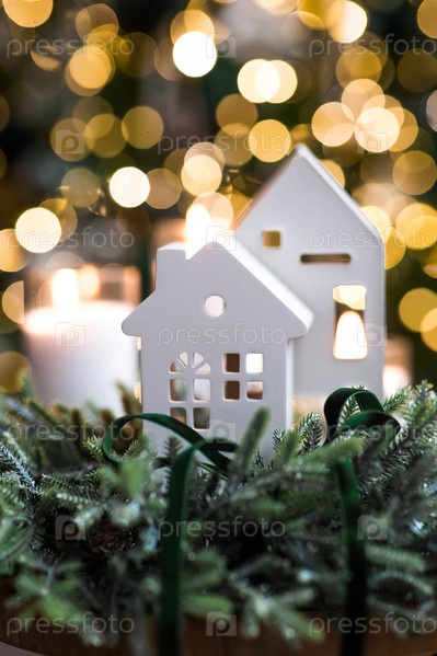 Белый скандинавский дом, еловые ветки и свечи на столе в гостиной. Новогодний декор в интерьере. Концепция подготовки дома к новогоднему празднику