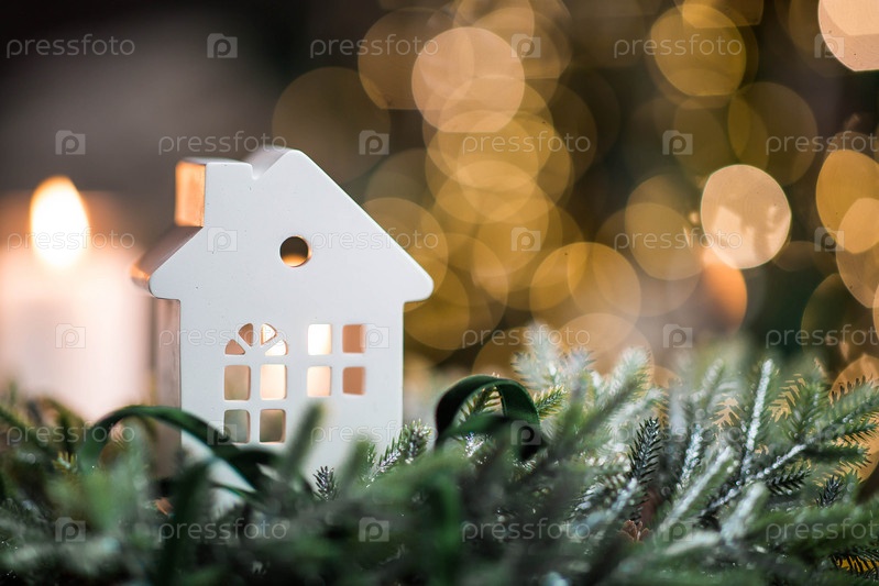 Белый скандинавский дом, еловые ветки и свечи на столе в гостиной. Новогодний декор в интерьере. Концепция подготовки дома к новогоднему празднику