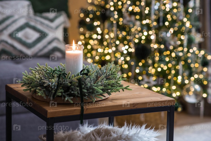 Сочельник. Свеча на столе в гостиной и еловый венок. Новогодний декор в интерьере. Концепция подготовки дома к Рождеству и Новому году