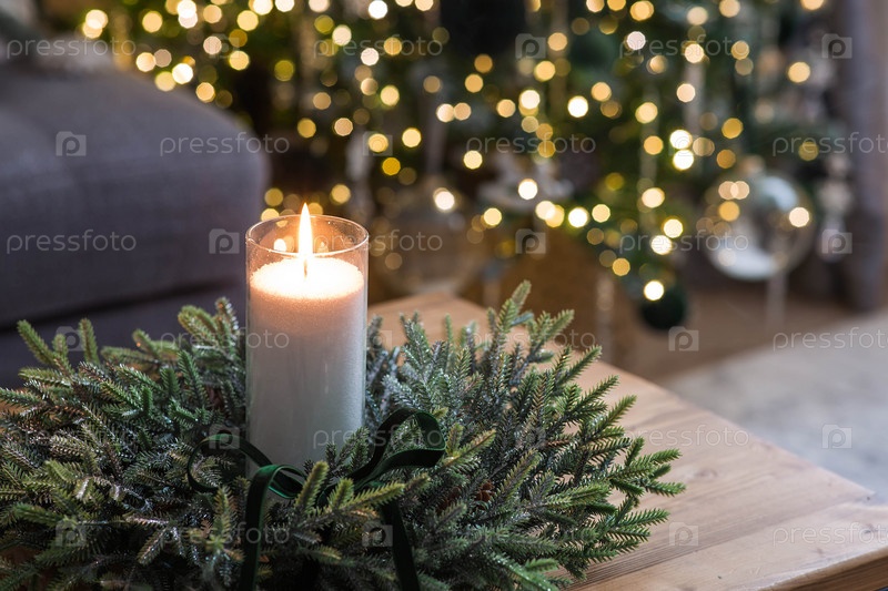 Сочельник. Свеча на столе в гостиной и еловый венок. Новогодний декор в интерьере. Концепция подготовки дома к Рождеству и Новому году
