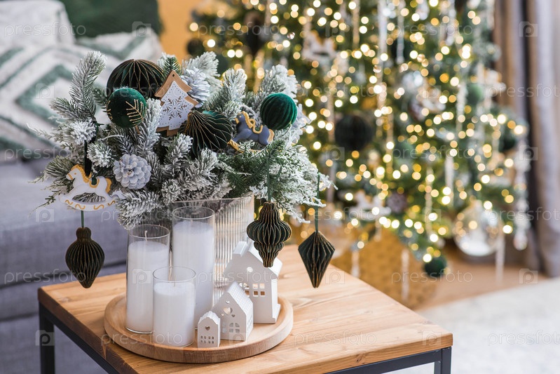Еловый букет с зелеными бумажными игрушками, лошадь и белые скандинавские домики на столе в гостиной. Новогодний декор в интерьере. Концепция подготовки к новогоднему празднику