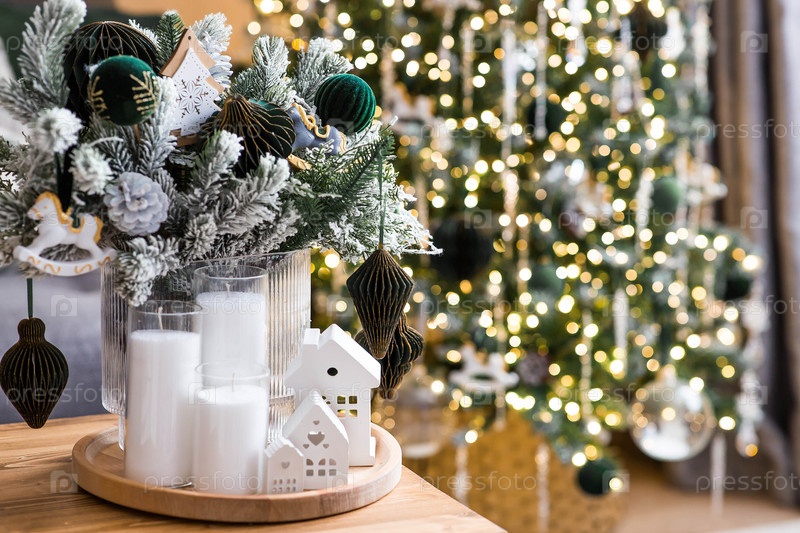 Еловый букет с зелеными бумажными игрушками, лошадь и белые скандинавские домики на столе в гостиной. Новогодний декор в интерьере. Концепция подготовки к новогоднему празднику