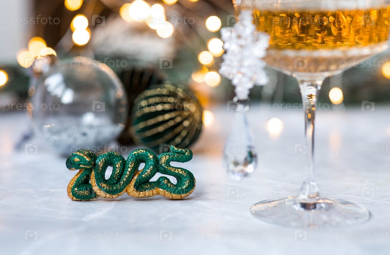 Символ года — зеленая змея, бокал шампанского, ветки елки и рождественские украшения на сером фоне. Концепция Веселого Рождества и Нового года 2025