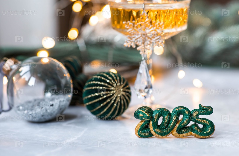 Символ года — зеленая змея, бокал шампанского, ветки елки и рождественские украшения на сером фоне. Концепция Веселого Рождества и Нового года 2025