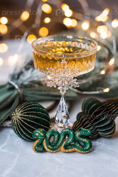 Символ года — зеленая змея, бокал шампанского, ветки елки и рождественские украшения на сером фоне. Концепция Веселого Рождества и Нового года 2025