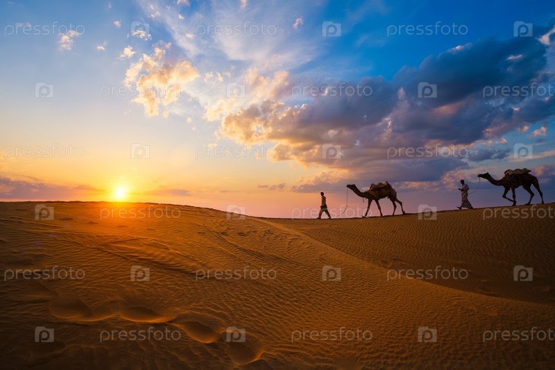 Индийские погонщики верблюдов, силуэты верблюдов в дюнах на закате. Джайсалмер, Раджастхан, Индия