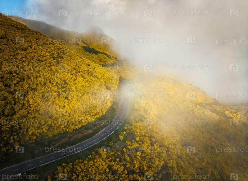 Вид с воздуха на дорогу среди цветущих кустарников Cytisus возле Пику-ду-Арейро, Португалия