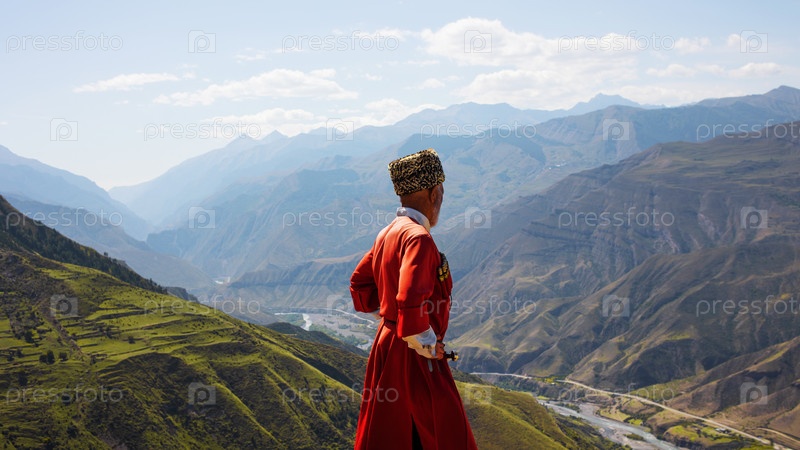 Дагестанский мужчина в национальном костюме, вид сзади, смотрит на горные просторы