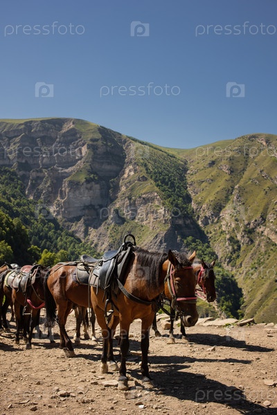 Табун оседланных лошадей спускается по горной тропе