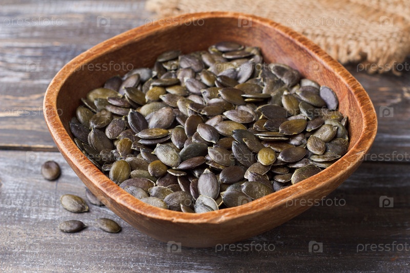 Сырые семена тыквы в деревенской деревянной миске на деревянном столе, покрытом мешковиной, место для копирования