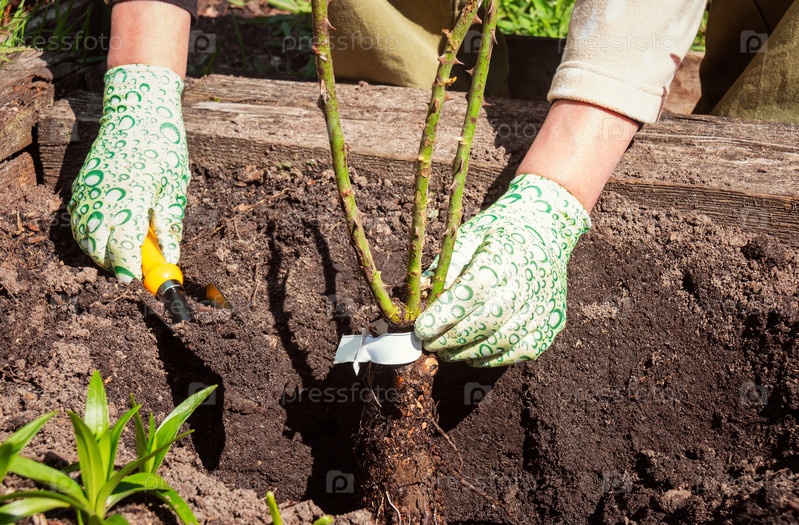 Посадка роз в саду в весенний солнечный день