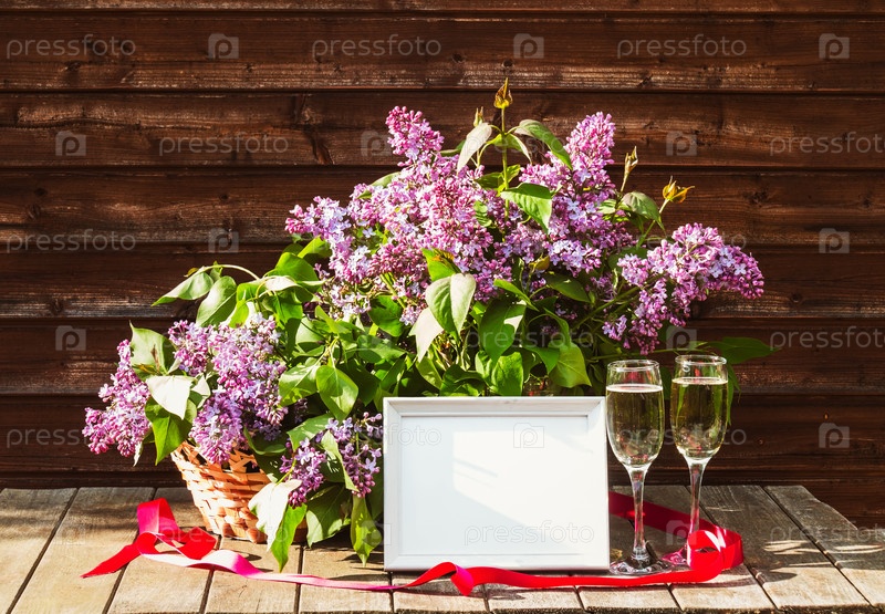 Белая рамка, бокалы шампанского и ветки сирени в вазе и в плетеной корзине на старом деревенском деревянном столе в весенний солнечный день. Вид с копией пространства