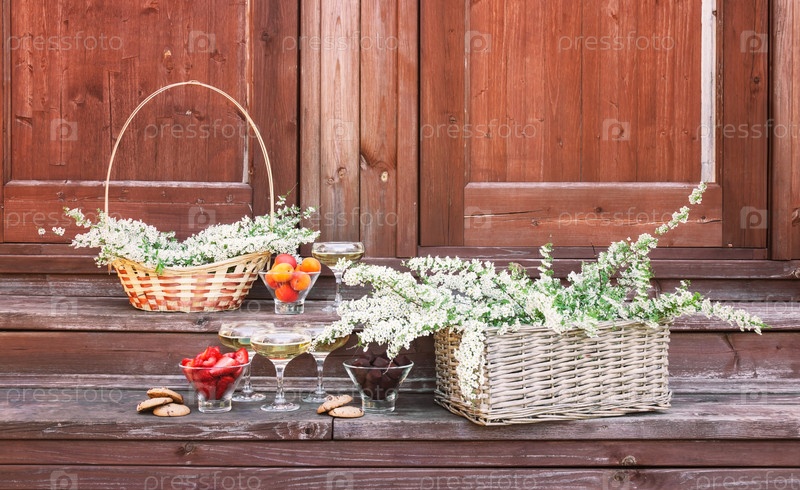 Серые цветы спиреи в плетеных корзинах, свежие фрукты, трюфельные конфеты, печенье и бокалы шампанского на ступенях деревенской деревянной лестницы