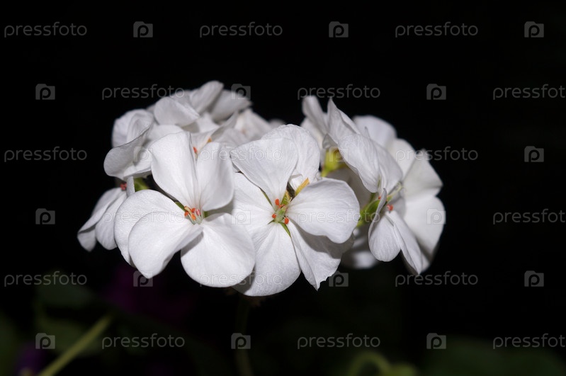 Цветы белоснежной герани сорта Люстра Вайт на контрастном черном фоне