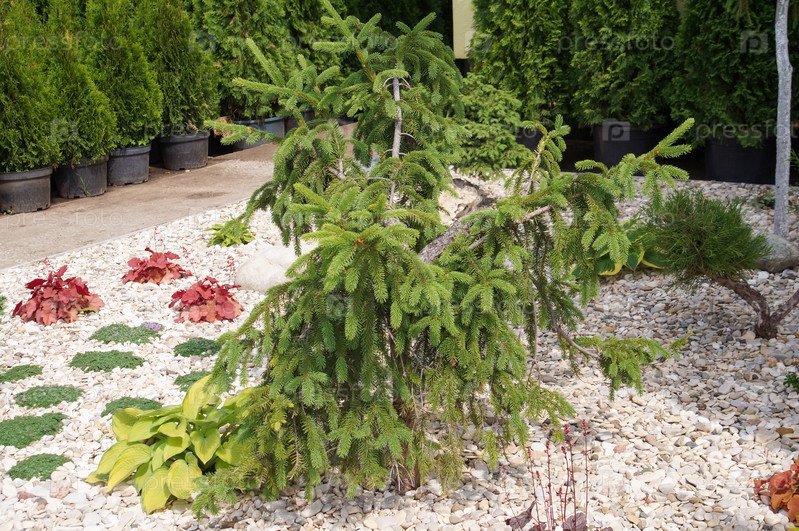 Эль Акрокона (Picea abies Acrocona) в ландшафтном дизайне на фоне свадебных саженцев