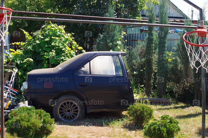 Половина машины стоит во дворе, окруженная растениями и спортивным инвентарем