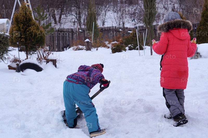 Дети помогают чистить снег во дворе