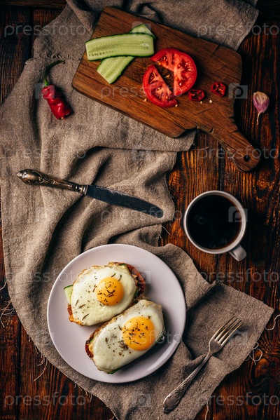 Завтрак: тосты с овощами и яичницей с чашкой кофе